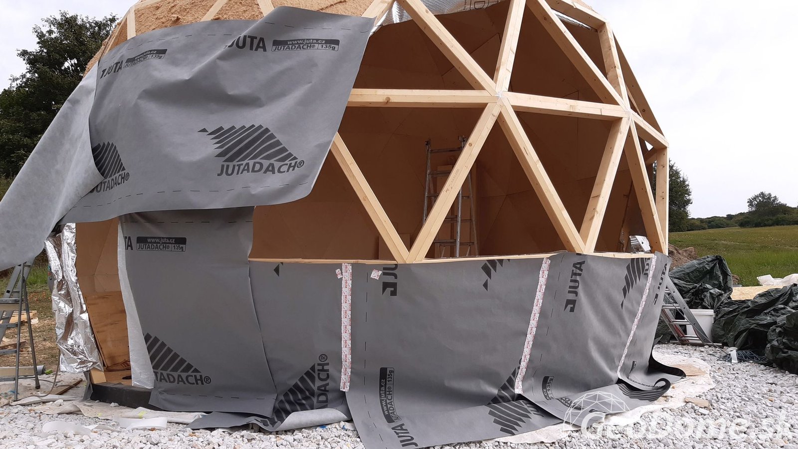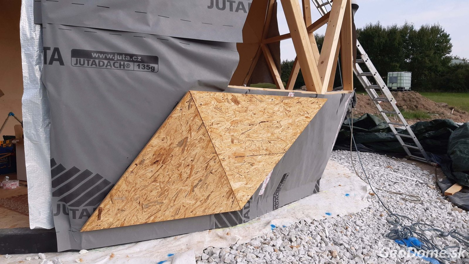 - vonkajšie debnenie – 18mm hrubá OSB doska + 40mm odvetrací priestor medzi poistnou hydroizolačnou fóliou a vonkajším debnením